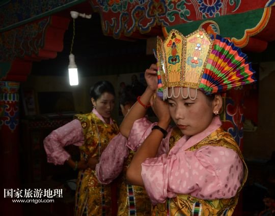 8月3日,在西藏堆龍德慶縣乃瓊鎮(zhèn),覺木隆藏戲團(tuán)演員次珍在望果節(jié)演出前練習(xí)。