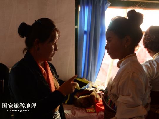 8月6日,在西藏堆龍德慶縣乃瓊鎮(zhèn),覺木隆藏戲團(tuán)演員巴桑(右)在村里的雪頓節(jié)演出前化裝。