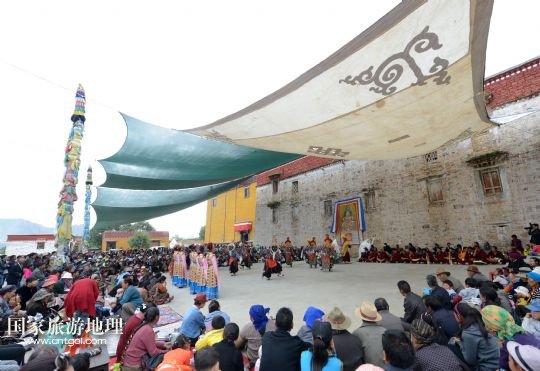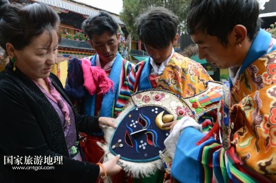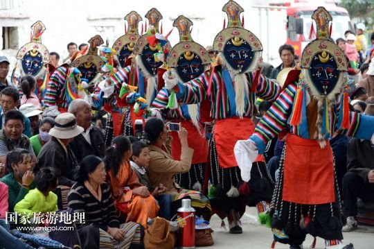 8月6日,在西藏堆龍德慶縣乃瓊鎮(zhèn)甲熱村舉行的雪頓節(jié)曬佛慶典上,甲熱村覺木隆藏戲團(tuán)的演員們?nèi)雸?chǎng)表演。