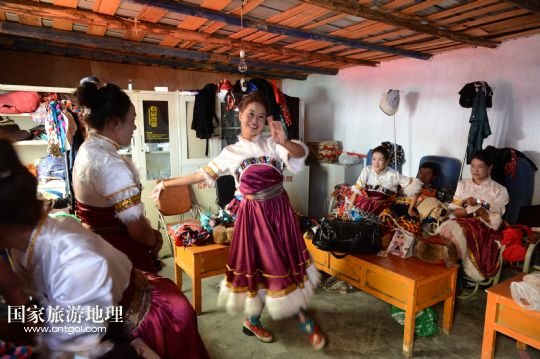 如今瓊達(dá)的藏戲團(tuán)每年演出200多場(chǎng)。一年一度的羅布林卡雪頓節(jié)藏戲匯演自然是重中之重,藏歷年和望果節(jié)也是劇團(tuán)最繁忙的時(shí)候。為了增加收入,劇團(tuán)還承接賓館酒樓和朗瑪廳等場(chǎng)所的小型演出任務(wù),表演內(nèi)容有藏戲,也有民族舞蹈。劇團(tuán)每年總收入二十多萬。演員參加排練一天工資50元,參加演出一天工資100元。在淡季,他們還要回到農(nóng)田干活。雖然在劇團(tuán)的收入不高,比起幾年前已經(jīng)有了很大進(jìn)步。