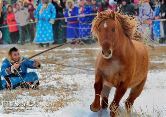 國家旅游地理 內(nèi)蒙古錫林郭勒1月5日訊 1月4日,牧民們在賽馬比賽中。當(dāng)日,2014年“銀色西烏珠穆沁”杰仁馬文化節(jié)在內(nèi)蒙古錫林郭勒盟西烏珠穆沁旗舉行。當(dāng)?shù)孛晒抛迥撩裆碇A麗的服飾,帶著自家的馬匹,冒著風(fēng)雪嚴(yán)寒,從四面八方趕到會場,參加了賽馬、套馬、乘馬拾物、蒙古馬選美等多項比賽,吸引了來自全國各地的游客、攝影愛好者以及附近的大批牧民。 /新華社記者任軍川攝