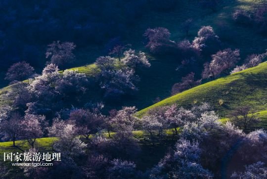 在新源縣吐?tīng)柛l(xiāng)的原始杏花林一處山坡上,杏花競(jìng)相綻放(4月10日)。