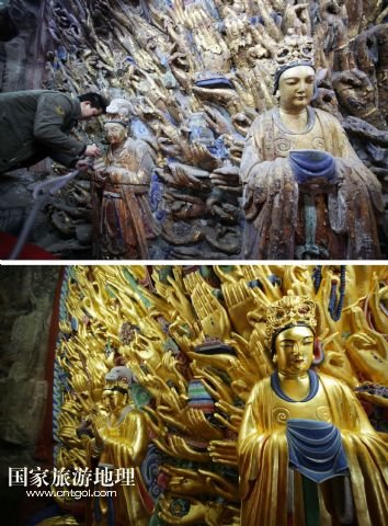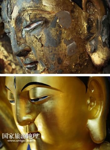 國(guó)家旅游地理 重慶6月13日訊 修復(fù)前后的重慶大足千手觀音造像局部(拼版照片,上圖上:2011年2月24日攝,上圖下:2015年3月31日攝)。