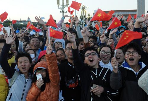 10月1日,天安門廣場舉行升國旗儀式。當(dāng)日清晨,來自全國各地的各族群眾在北京天安門廣場觀看升國旗儀式,慶祝中華人民共和國成立66周年。新華社記者 邢廣利 攝