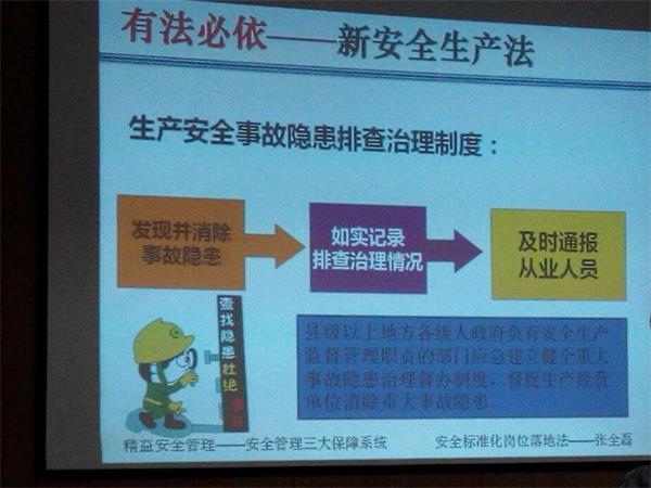 本次培訓(xùn)由著名的安全管理咨詢師張全磊老師主講,培訓(xùn)從安全第一(強(qiáng)化安全意識(shí)杜絕習(xí)慣違章)、預(yù)防為主(做好危害辨析消除現(xiàn)場(chǎng)隱患)、綜合治理(落實(shí)安全標(biāo)準(zhǔn)化安全管理體系化)三大方面展開。